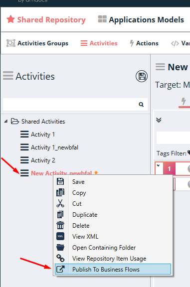 - All Actions will be listed down for the Activity. Click on the Add to Shared Repository as shown below.