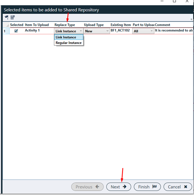- To Upload Activity as Linked instance, please select Replace Type as ‘Link Instance’